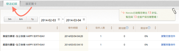 自動賀卡頁中切換「發送記錄」欄位,即可觀看過去系統自動寄發那些信件於客戶。