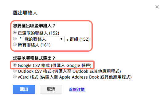 3.匯出聯絡人,請選擇您要匯出的範圍。格式請選「Google CSV格式」